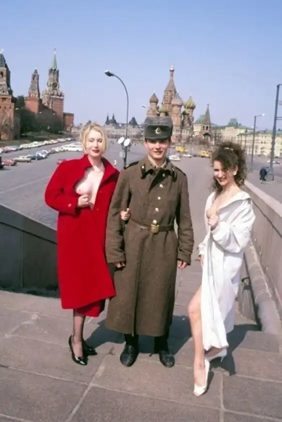 32. Московская школа стриптиза на фоне собора Василия Блаженного на Красной площади в Москве, 9 июня 1992 год
