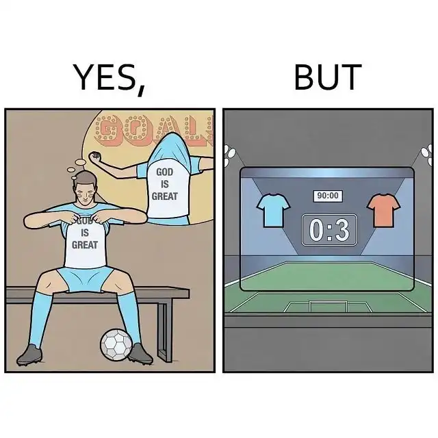 Надпись на футболке гласит: «Бог велик». Но художник поясняет, что рисунок о том, что у игрока не было причин показывать сообщение на внутренней футболке, так как он не забил гол. Так что сам посыл и текст не играют никакой роли, но люди могут поискать и другие смыслы.