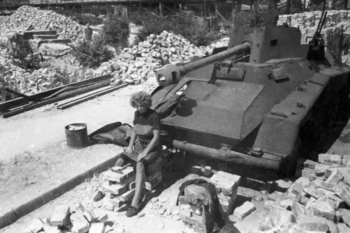 Женщина у подбитого немецкого тяжелого бронеавтомобиля Sd.Kfz. 234/4 с 75-мм противотанковой пушкой Pak 40/2 L/46 (таких машин было всего построено 89 ед.) в центре Берлина после боев за город. 1945 год