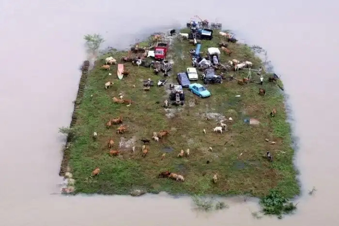 Это не диорама. Это настоящий остров, полный людей и животных, которые пережили наводнения в Малайзии