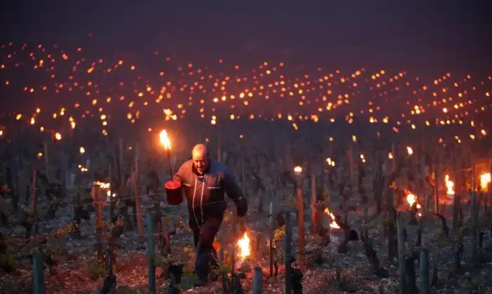 Французские фермеры используют огонь, чтобы спасти свои виноградники в холодные ночи