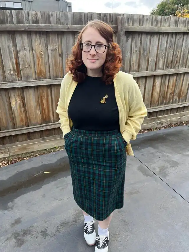 Образ 1960-х: юбка, кардиган, брошь и туфли-лодочки с носками