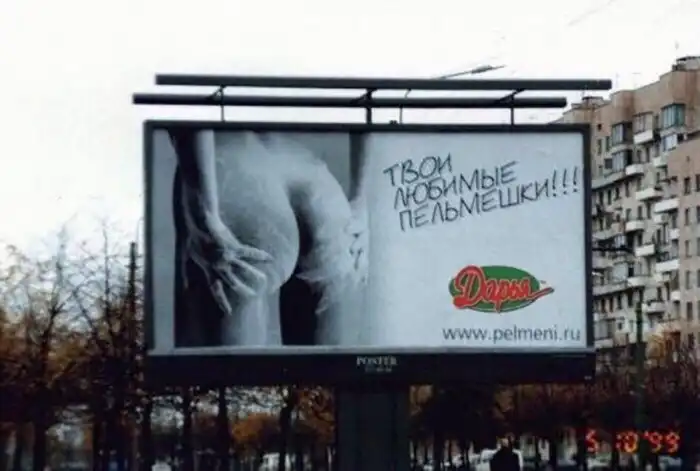 38. Реклама пельменей "Дарья" (бренд, созданный 23 года назад Олегом Тиньковым и проданный в 2001-м за $21 млн Роману Абрамовичу). На фото Санкт-Петербург, 1999 год