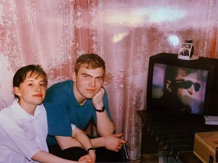 Молодые люди фотографируются со своим первым телевизором. Россия, 1995 год.
