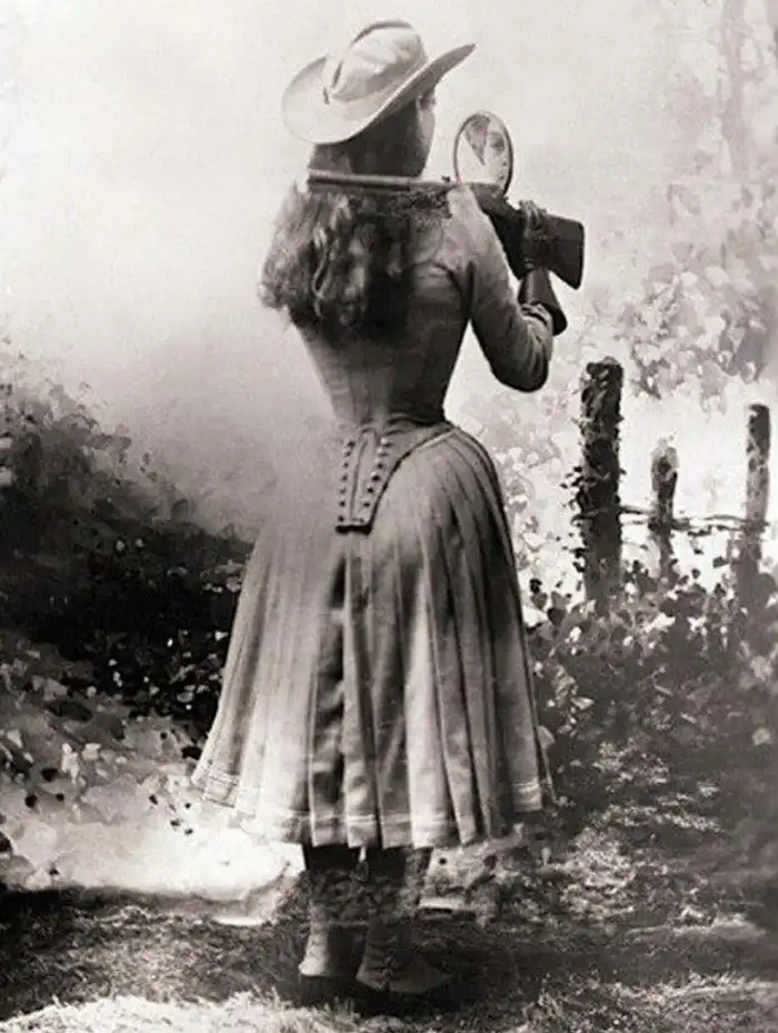 Энни Оукли демонстрирует свой знаменитый трюк с зеркалом для камеры, 1890-е годы