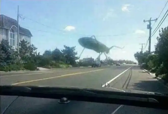 12. Снимок кузнечика на лобовом стекле. Похоже на Годзиллу, который собирается разрушить город до основания