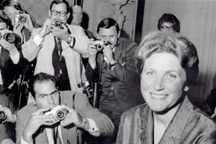 11. Дочь Сталина Светлана Иосифовна Аллилуева во время открытой пресс–конференции в Нью–Йорке, 1967 год