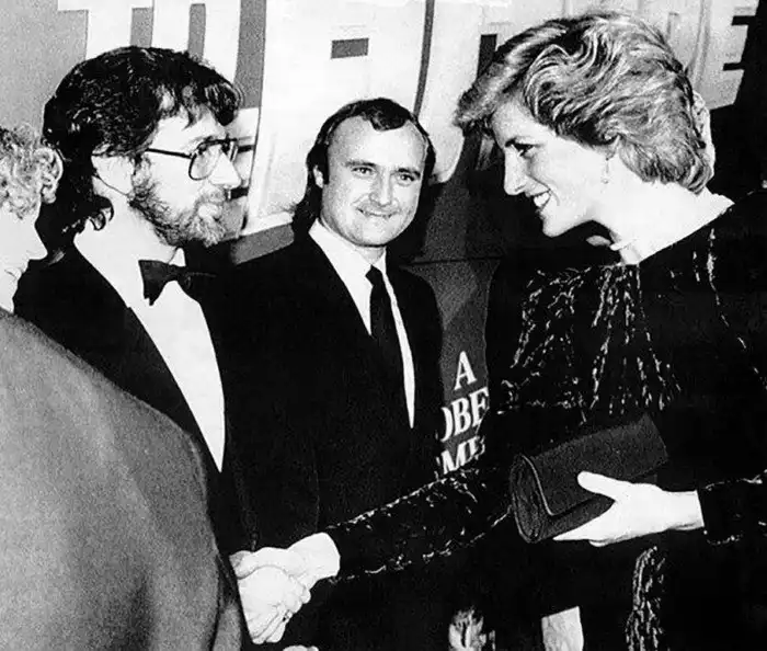 18. Стивен Спилберг, Фил Коллинз и Принцесса Диана на британской премьере фильма "Назад в будущее", 1985 год