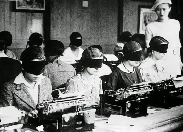 19. Машинистки печатают вслепую. Конкурс на лучшее владение печатной машинкой. Париж, 1940 год