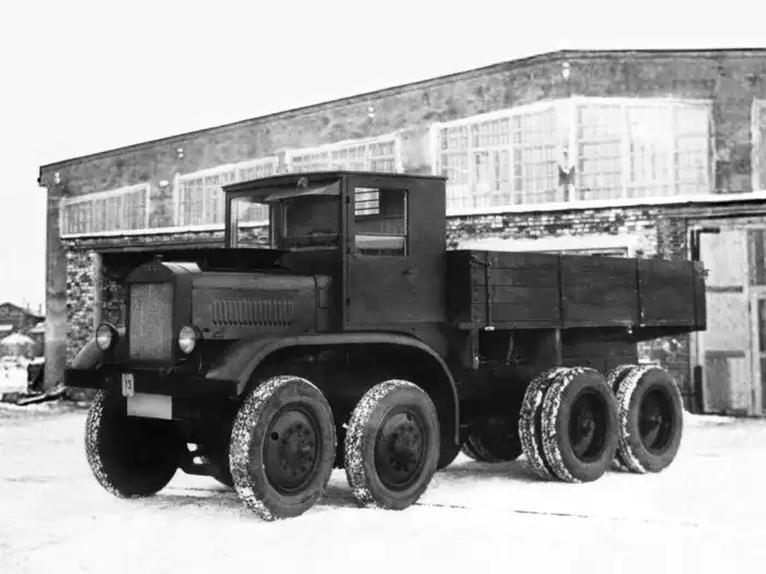 29. ЯГ-12 – опытный четырехосный грузовой автомобиль, построенный в 1932 году на Ярославском автозаводе. Это первый советский автомобиль с колесной формулой 8x8