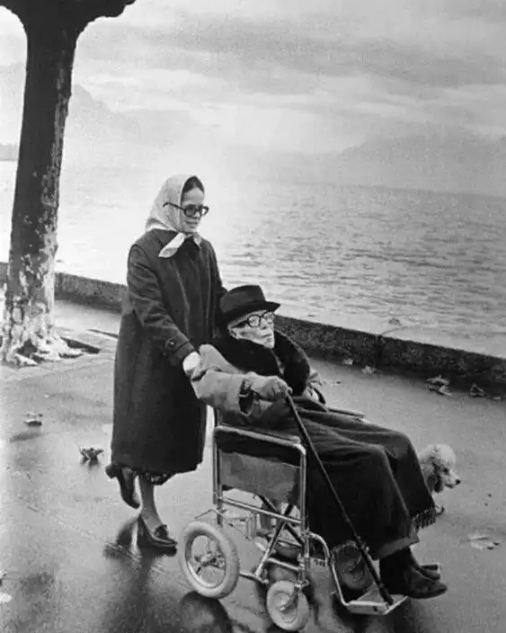 6. Последнее фото Чарли Чаплина в сопровождении его жены Уны на прогулке по берегу озера Леман в Веве, Швейцария, октябрь 1977 года