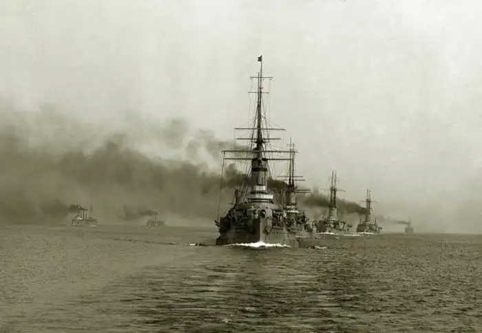 На переднем плане 2-я бригада линейных кораблей под флагом вице-адмирала Людвига Кербера - броненосцы "Цесаревич", "Слава", "Андрей Первозванный" и "Император Павел I"