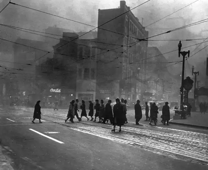 16. Люди идут по центру Питтсбурга на углу улиц Свободы и Пятой авеню. Загрязненный воздух из-за постоянного использования угля при отоплении и сжигании мусора в городе значительно затемняет это фото, сделанное примерно в 10.35 утра. 1938 года