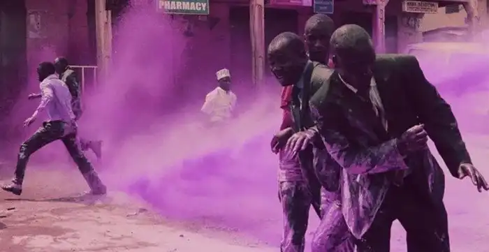 20. Противников апартеида, выступающих на демонстрации за свои права, поливают из водяной пушки лиловой краской, чтобы потом их можно было определить и арестовать. Южная Африка, 1989 год