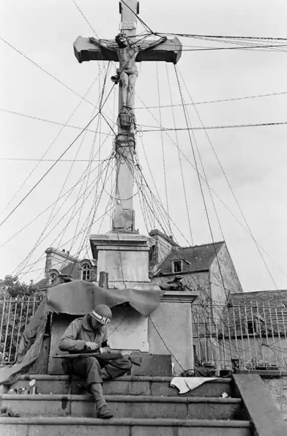 23. Военный полицейский армии США чистит трофейную немецкую винтовку G41 на перекрестке в Этьенвиле, Франция, июль 1944 года