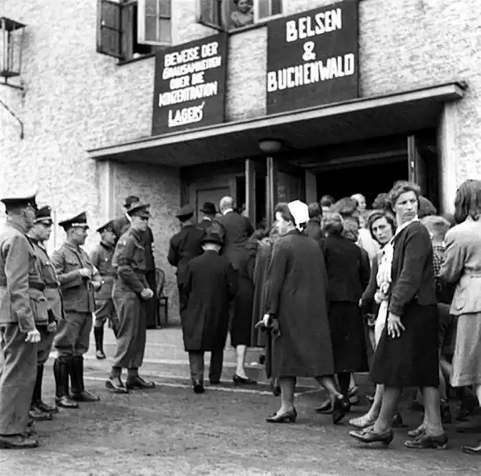 Британские военнослужащие организованно заводят немцев в кинотеатр для просмотра документального фильма о преступлениях нацистского режима Гитлера.