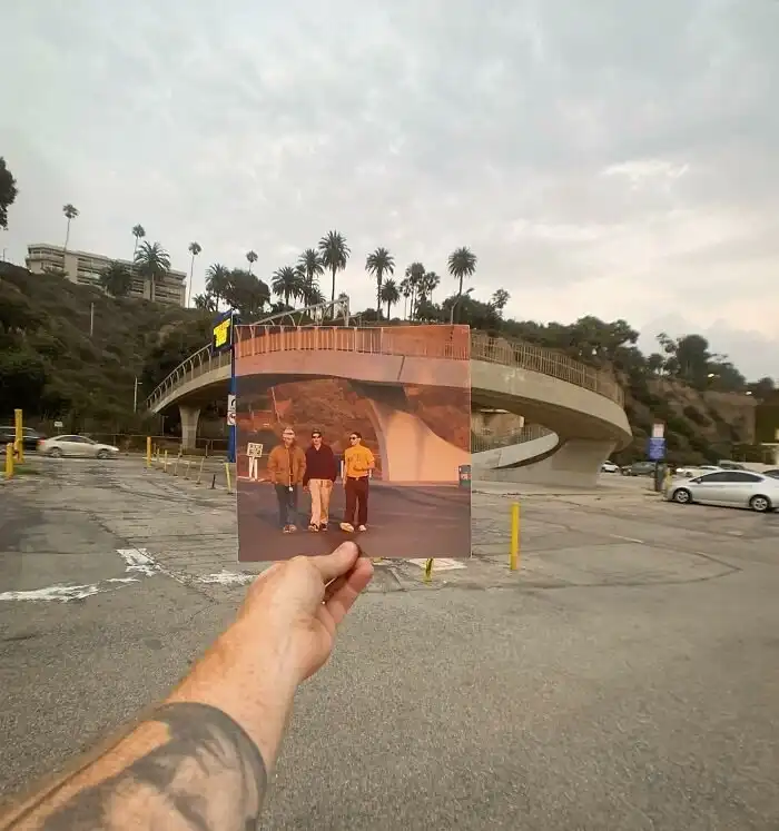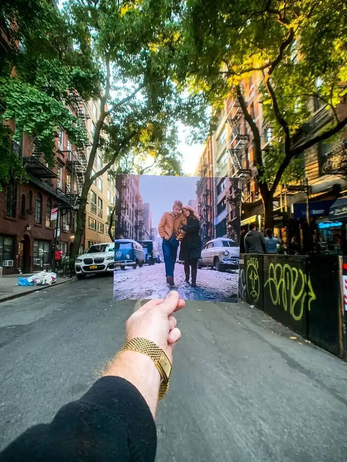 Стив Бирнбаум воссоздает историю музыки, фотографируя распечатку культового снимка в своей руке на фоне места, где он был сделан много лет назад. А чтобы отыскать эти места, он просматривает множество интервью, ищет информацию о фотографах и где находились музыканты в то время, а также часами изучает улицы в Google Maps. С 2010 года он успел сделать более 500 таких фото, и вот 30 лучших.