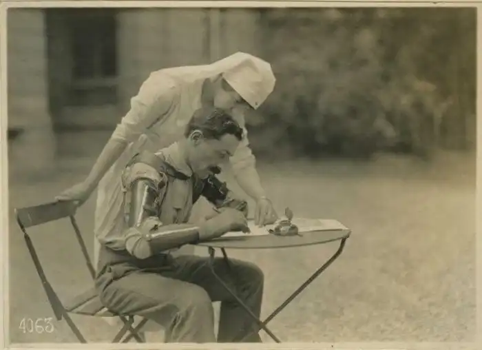 Французский солдат учится писать с новыми протезами, после Первой мировой войны, 1918 год
