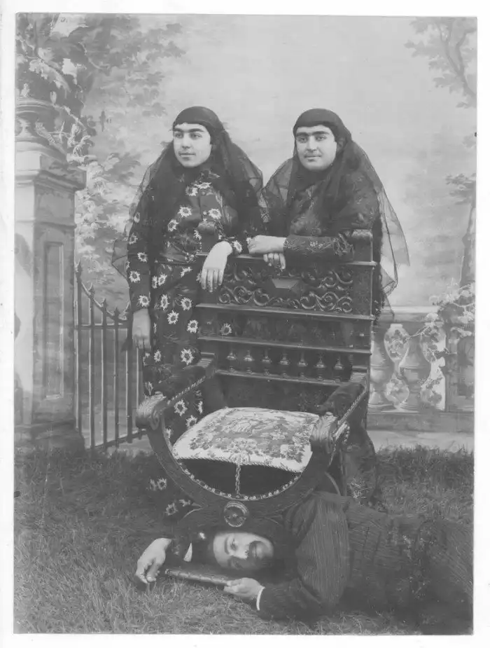 Отец позирует со своими двумя дочерьми в конце девятнадцатого века, Каджар, Иран