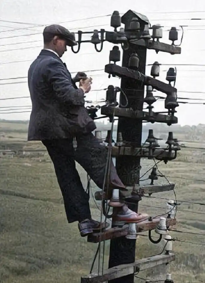 Линейный работник, работающий на электрическом столбе около 100 лет назад