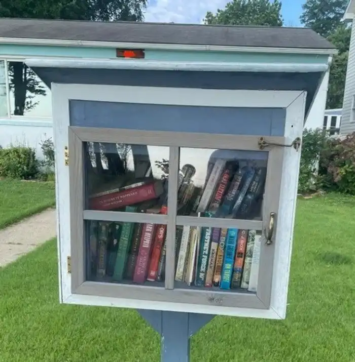 Ящик с мини-библиотекой на улице. Жители сдают ненужные книги, и книгу может взять любой желающий, главное условие - вернуть обратно