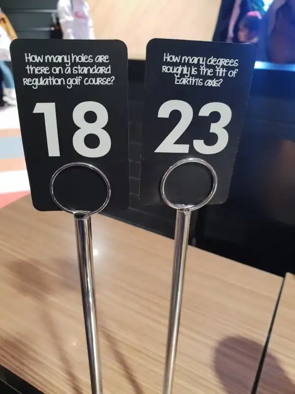 Номер вашего столика рассказывает вам любой факт из жизни, где присутствует это число. Первый номерок говорит, что количество лунок на стандартном поле для гольфа — 18. А цифра 23 означает примерный угол наклона оси вращения Земли