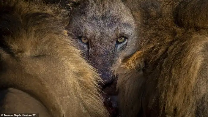 Этот гипнотизирующий портрет льва в заповеднике Мореми на восточной стороне дельты Окаванго в Ботсване стал победителем в категории «Дикие портреты». Польский фотограф Томаш Шпила так описывает историю этого снимка: «Когда огромный лев смотрит тебе прямо в глаза, ты сразу же забываешь, что сидишь в машине в безопасности. Ты инстинктивно съеживаешься и медленно отступаешь вглубь машины, чтобы не спровоцировать хищника. К счастью, он и его братья были заняты поеданием молодого буйвола, на которого охотились чуть раньше».