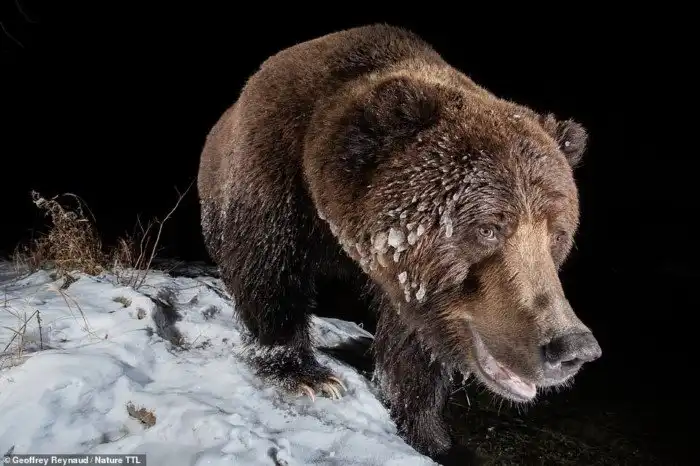 Данный снимок занял первое место в категории «Фотоловушки». В кадре - большой медведь гризли», проходящий перед фотоловушкой в районе деревни Клукшу на Юконе, Канада. Его запечатлел француз Жоффруа Рейно. Он говорит: «На Юконе в декабре температура достигает -30 градусов, и у медведей заледеневает мех, - уникальное явление! - говорит он. - Этот снимок был сделан фотоловушкой, установленной у реки примерно за два дня до снежной бури. Температура упала только до -15 градусов, и медведь только начинал превращаться в «ледяного медведя».