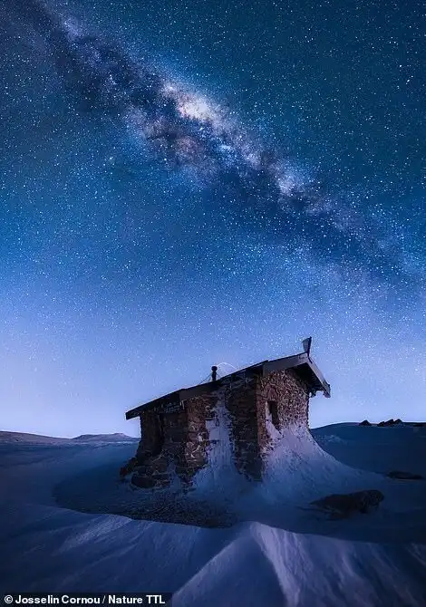 Эта фотография заняла первое место в категории «Ночное небо». Это работа французского фотографа Жослена Корну, сделанная во время поездки на самую высокую точку Австралии - гору Костюшко в Новом Южном Уэльсе. На нем видны звезды в небе над Хижиной Моряка, альпийской хижиной на пути к горе, построенной в память о двух лыжниках, погибших в 1928 году. Корну отмечает, что гора Костюшко — «одно из лучших мест, где можно запечатлеть Млечный Путь», отчасти благодаря ничем не подсвеченному небу.