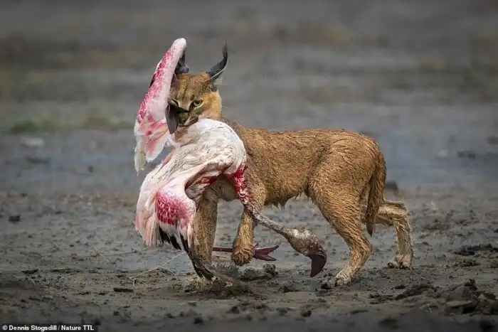 Этот снимок принес Деннису Стогсдиллу из США звание абсолютного победителя конкурса. Фотография, которая также получила главный приз в категории «Поведение животных», была снята в регионе Ндуту в Танзании. Американский фотограф рассказал ее историю: «Мы получили известие о сервале, охотящемся на птиц на берегу озера Ндуту, и помчались смотреть на него. По прибытии мы быстро поняли, что на самом деле это был каракал, а не сервал, и охотился он на фламинго, которые кормились на мелководье. В течение минуты после прибытия каракал начал преследование и, в конце концов, схватил одну из красивых птиц. На этом изображении вы видите, как каракал уходит со своей добычей».