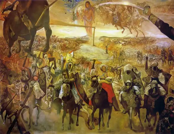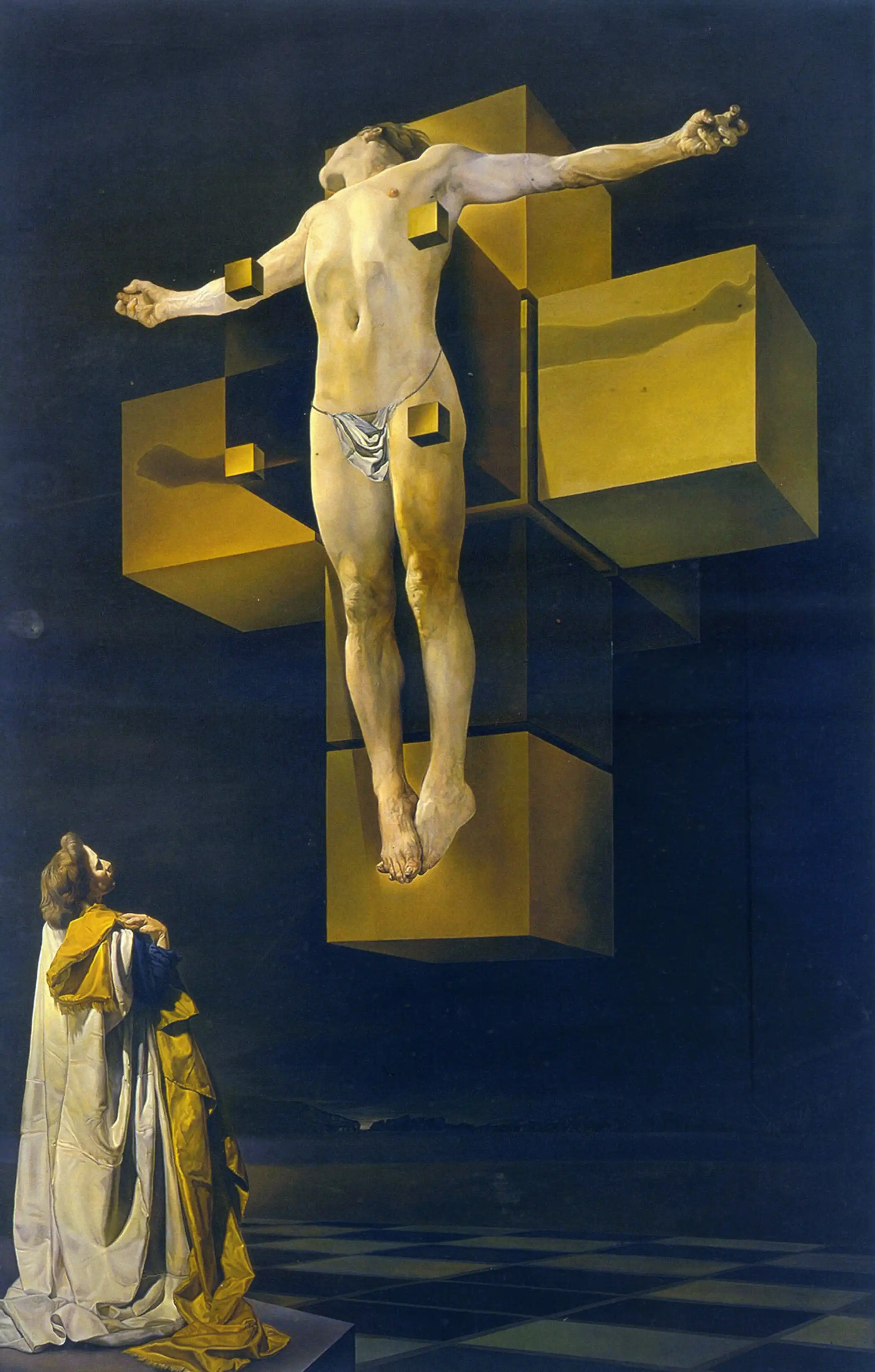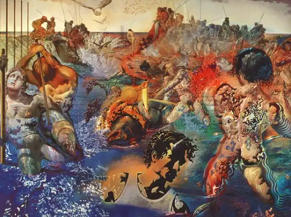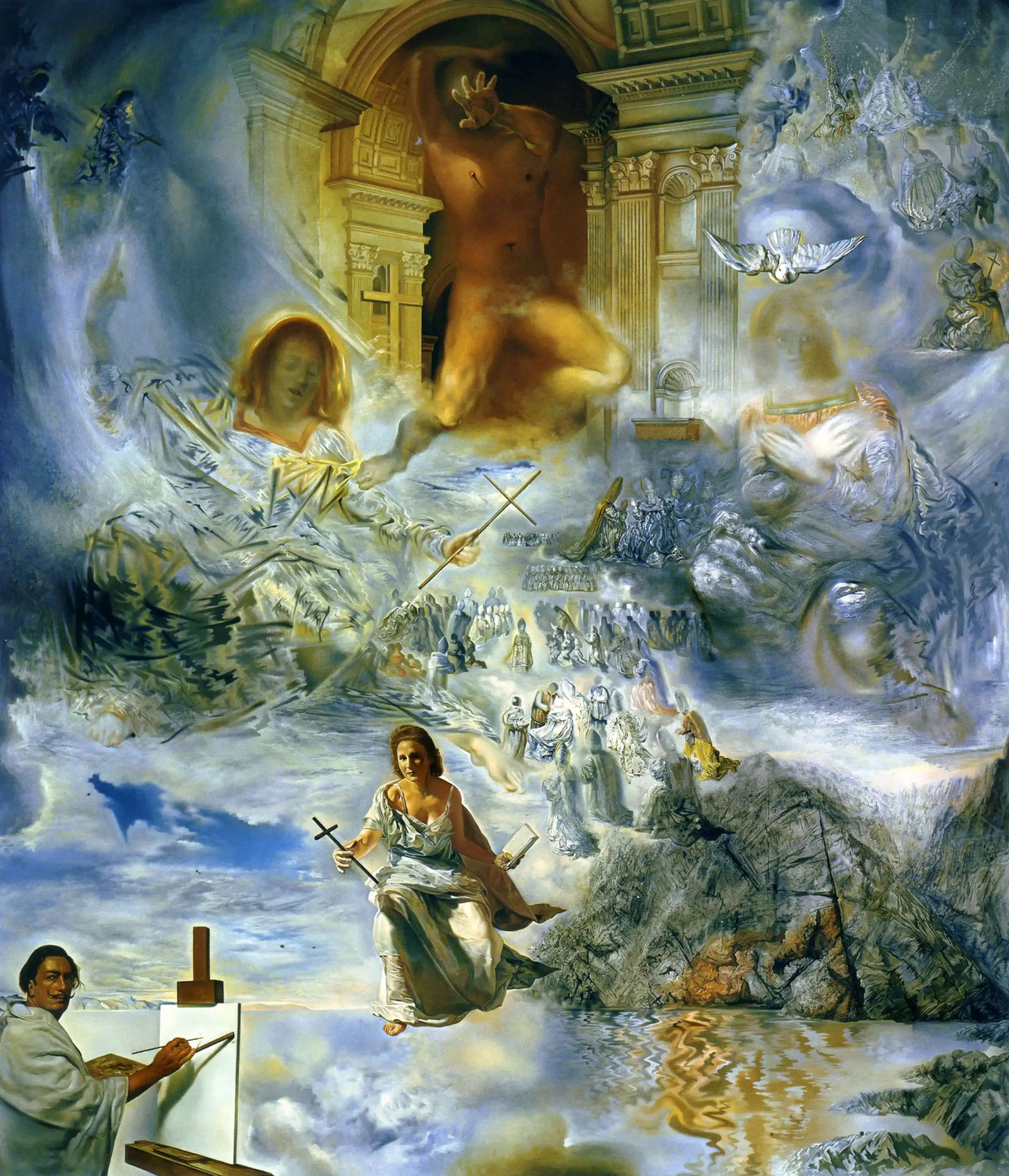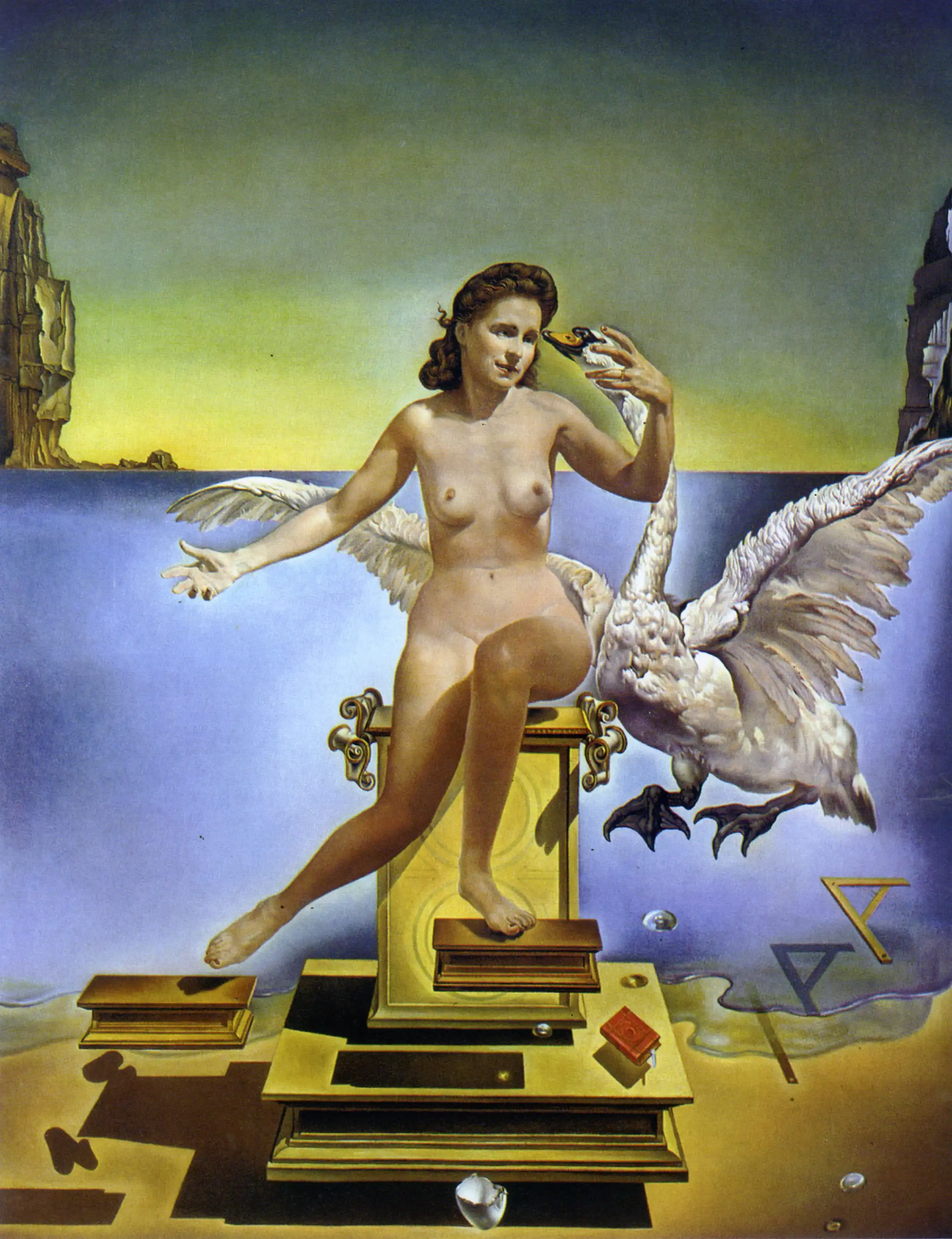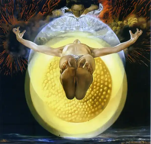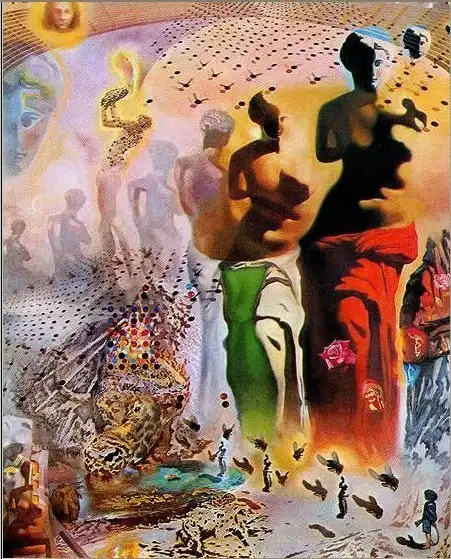 Обнажённый Дали, созерцающий пять упорядоченных тел, превращающихся в корпускулы, из которых неожиданно сотворяется Леда Леонардо, наделённая лицом Галы. Фрагмент.