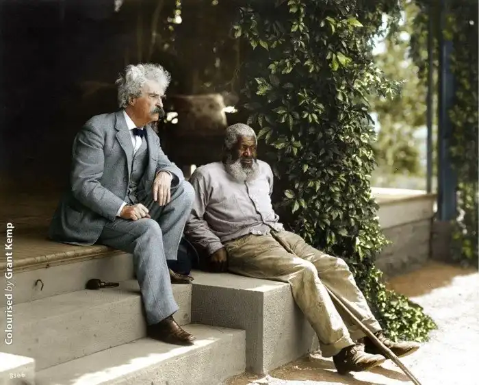 8. Марк Твен сидит на крыльце со своим давним другом Джоном Т. Льюисом, прототипом Джима из «Приключений Гекльберри Финна»