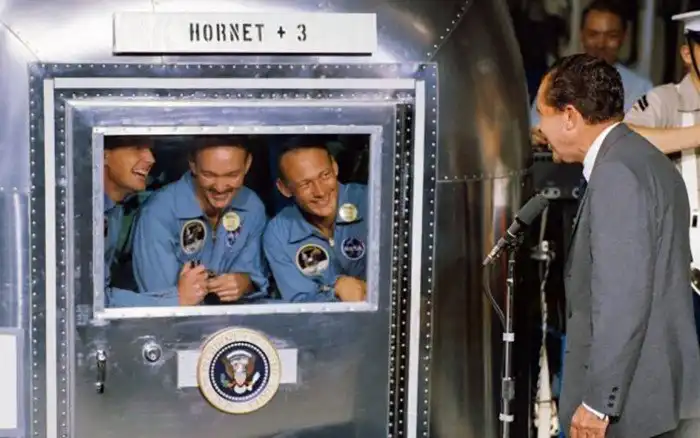 21. Американский президент Ричард Никсон навещает команду «Аполло 11», находящуюся в мобильной карантинной капсуле после возвращения с Луны