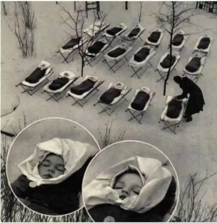29. Детей укладывают спать на улице для укрепления иммунитета, Москва, 1958 год