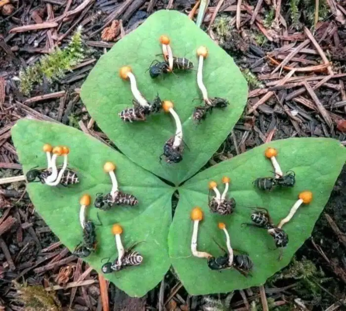 33. Кордицепс однобокий, более известный как "Гриб зомби-муравей". Он заражает мозг муравья, заставляя его найти подходящий лист и прикрепиться к нему. Со временем из головы муравья прорастает гриб, и в конечном итоге муравей разрывается, чтобы выпустить споры