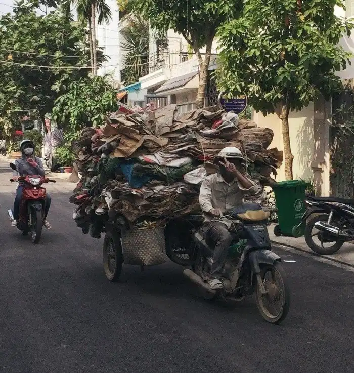 Парень из моего района в Хошимине. Он зарабатывает на жизнь сбором картона для дальнейшей переработки.