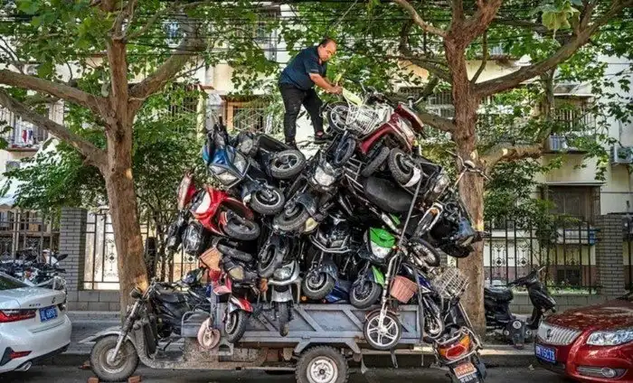 Мужчина складывает утилизированные электровелосипеды и скутеры на свой трёхколесный электрический велосипед для переработки, Пекин