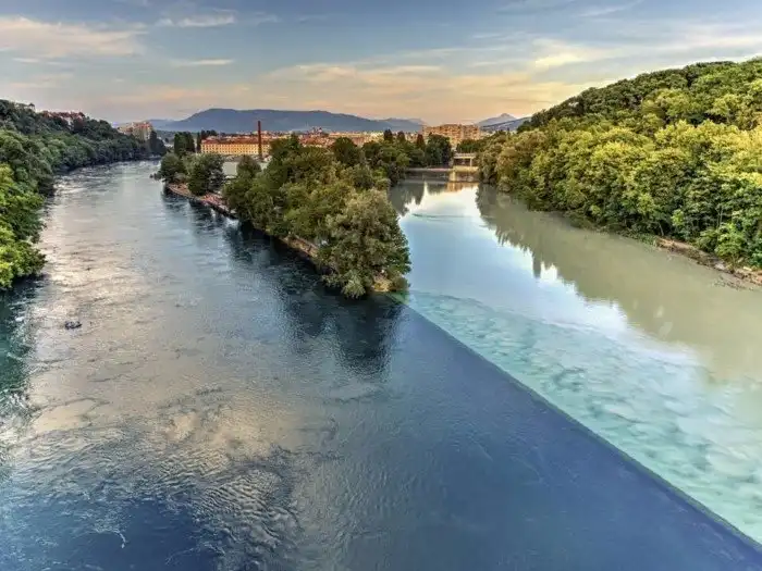 Две реки (Рона и Арв) сталкиваются в Женеве. Они питаются разными ледниками и имеют разные отложения в воде