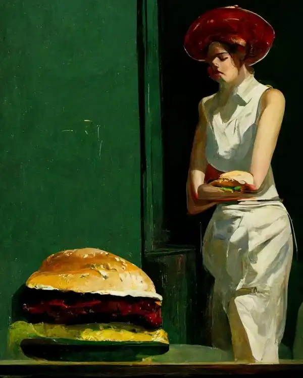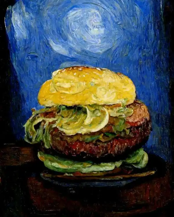 Представьте, если бы величайшие художники мира рисовали... бургеры. Именно такую странную задачу поставил мультимедийный художник Александр Доброкотов нейросети. И что интересно, она полностью справилась со своей задачей. Нейросеть действительно изобразила обычные бургеры в духе известных художников. Давайте поглядим на эти натюрморты.