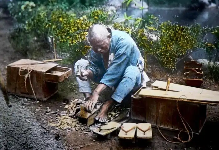 12. Бродячий торговец обуви гэта, изготавливает свою продукцию. Япония 1915 г., Фотограф Эльстнер Хилтон