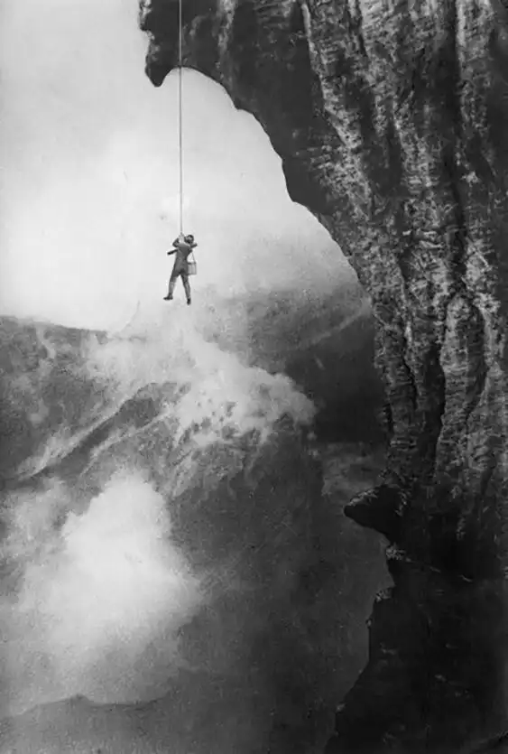 13. Вулканолог Арпад Кернер висит на веревке над пылающим кратером вулкана Стромболи, 1933 год, Италия