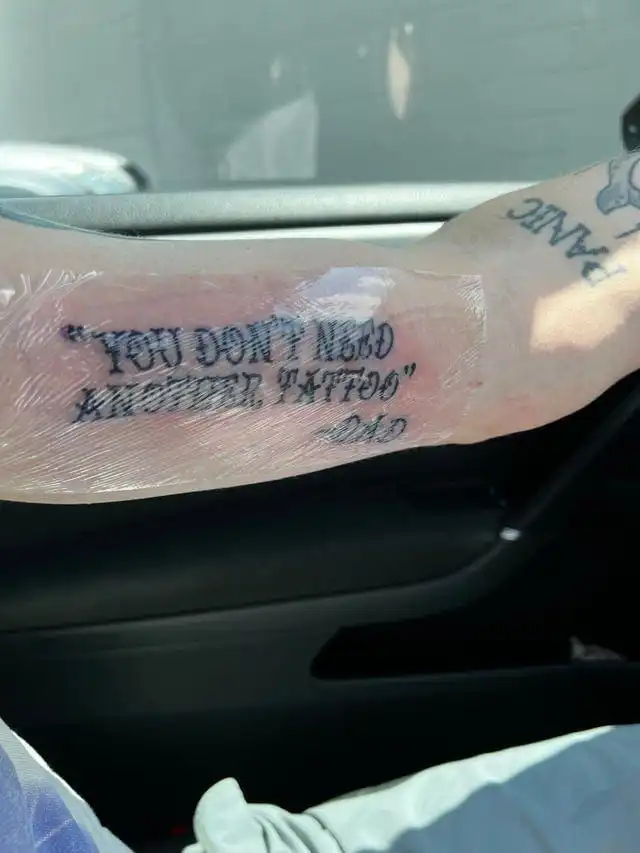 Видимо, папа ответил: «Тебе не нужна ещё одна татуировка». Эта надпись и появилась на руке.