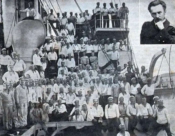 21. Команда крейсера «Очаков» за две недели до восстания 14 (27) ноября 1905 г. и лейтенант Шмидт (в верхнем правом углу)