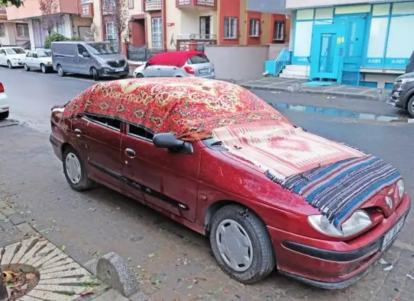 На улицах повсюду можно увидеть машины, накрытые коврами. Оказывается, турки делают так, чтобы уберечь свой транспорт от дождя с градом. Также машины накрывают пледами или картоном. Такая картина совершенно нормальна для Турции.