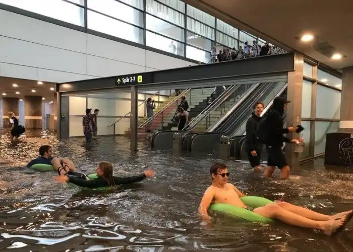 Железнодорожный вокзал в Швеции был затоплен после сильного шторма. Его появления было спровоцировано резким поднятием температур по всей Европе. Местные жители не растерялись и превратили пространство, заполненное водой, в настоящий бассейн. Они вооружились надувными лодками, масками для подводного плаванья, водяными пистолетами и отлично провели свободное время.