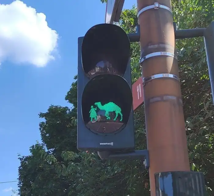 «На этом светофоре в Германии сигнальные огни сделаны в форме маленькой девочки с верблюдом»