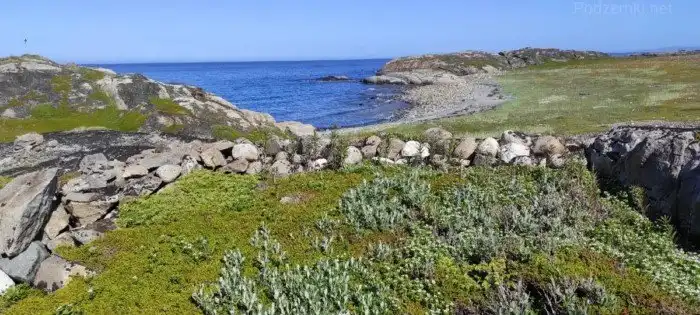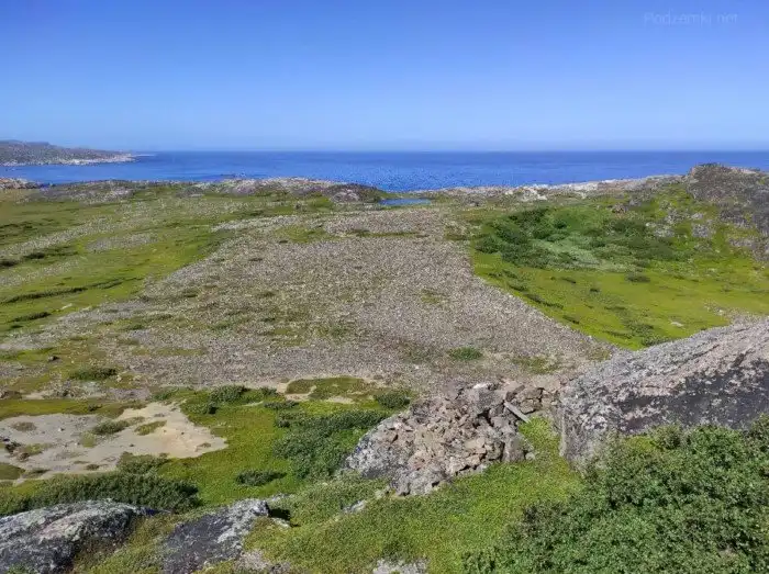 Примерно через четыре часа я наконец-то добрался до открытого моря. Слева видно вход в залив, а снизу сохранившуюся немецкую огневую точку. Вид из нее был очень красивый: альпийские луга, Баренцево море и Норвегия на горизонте.