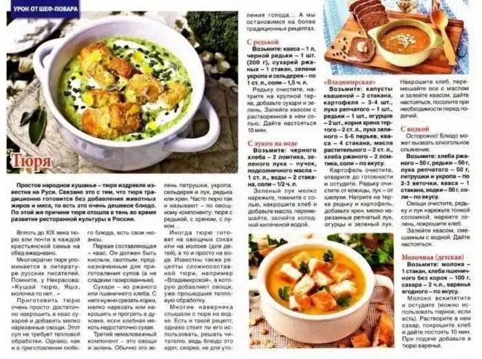 А это уже из русской кухни: тюря — это кусочки хлеба, залитые чем-нибудь (квасом, простоквашей или молоком)