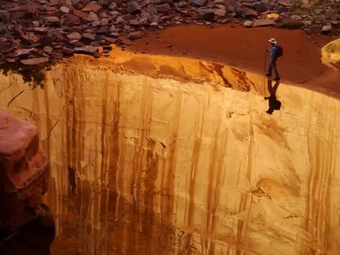 К слову об отражениях. Так оно выглядит у руки внутри Глен-Каньона, из-за чего выглядит так, будто человек идёт не по берегу, а по краю обрыва.