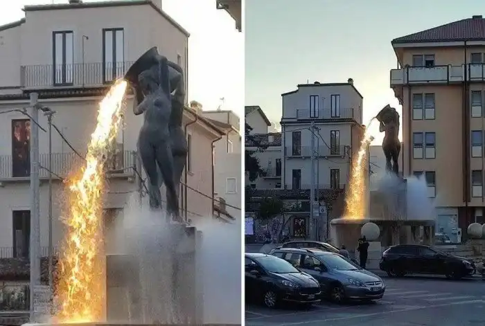 Не менее интересные иллюзии создаёт солнечный свет вкупе с водой. Подобное заметили в фонтане в итальянском Л’Акуиле. Выглядит так, будто скульптуры выливают из своих чаш настоящую лаву.